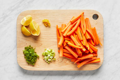 Trim, peel, and cut carrots into sticks (like fries; ours were 3 inches long and ⅓ inch thick). Trim and thinly slice scallions, separating whites from greens. Zest and quarter lemon.