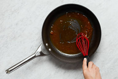 Stir in jam, stock concentrates, ¼ cup water (⅓ cup for 4 servings), and a squeeze of lemon juice. Simmer until thickened, 3-5 minutes.