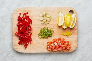 Halve, core, and thinly slice bell pepper into strips. Trim and thinly slice scallions, separating whites from greens. Zest and quarter lemon.