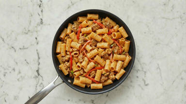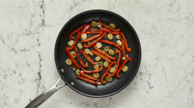 Season with salt and pepper. If you like things spicy, stir in a pinch of chili flakes and cook until fragrant, 15 seconds. TIP: If there’s excess grease in your pan, carefully pour it out.