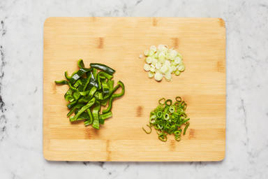 Halve, deseed, and thinly slice green pepper into strips. Trim and thinly slice scallions, separating whites from greens.