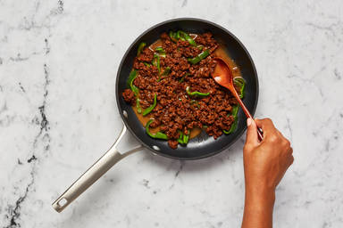 Add a drizzle of oil to pan with green pepper. Add beef*, scallion whites, and Southwest Spice Blend; season with salt and pepper. Cook, breaking up meat into pieces, until beef is browned and cooked through, 4-6 minutes. TIP: If there’s excess grease in your pan, carefully pour it out.