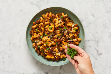 Top beef cavatappi with remaining Mexican cheese blend; cover pan until cheese melts, 1-2 minutes. Divide between bowls; top with scallion greens and serve.