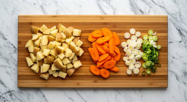 Peel potatoes if desired, then dice into ½-inch pieces. Trim, peel, and cut carrots on a diagonal into ½-inch-thick pieces. Trim and thinly slice scallions, separating whites from greens.
