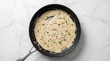 Add vinegar to pan. (TIP: Push the pan away from yourself when adding vinegar.) Once bubbles subside, stir in scallion greens, cream sauce base, stock concentrate, and 1 TBSP water (2 TBSP for 4). Cook, stirring, until thickened, 30-60 seconds.