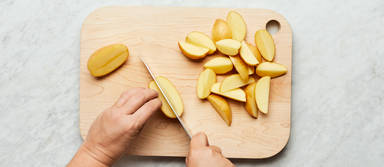 Cut potatoes into ½-inch-thick wedges. Halve, peel, and thinly slice onion.