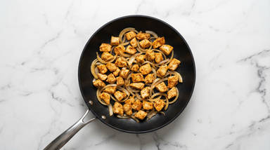 Open package of chicken* and drain off any excess liquid. Heat a drizzle of oil in pan used for onion over medium-high heat. Add chicken, Frank's Seasoning Blend, salt, and pepper; cook, stirring, until chicken is browned and cooked through, 4-6 minutes. Return sautéed onion to pan; stir to combine.