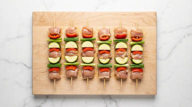 - Carefully thread chicken, scallions, bell pepper, and zucchini onto skewers, alternating ingredients. (You should have 6-8 skewers; 12-16 for 4 servings. If you have extra veggies, save for another use.) Season generously all over with salt and pepper.