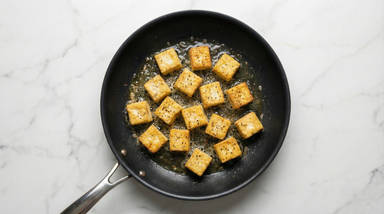 Heat a large drizzle of oil in a large pan over medium-high heat. Add tofu in a single layer and cook until golden and crispy, 1-3 minutes per side. (For 4 servings, you may need to work in batches, adding another drizzle of oil per batch.)