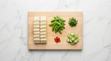 Trim and thinly slice cucumber into rounds. Open and drain tofu; press out excess water with paper towels. Halve crosswise, then stand tofu upright and halve vertically. Lay flat and cut into ¾-inch cubes. Trim and remove strings from snap peas. Thinly slice chili, removing seeds for less heat. Roughly chop cilantro.