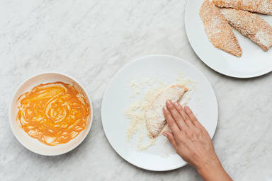 Dip each fillet into sour cream mixture, then press into panko mixture, coating all over.