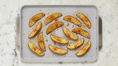 Toss potatoes on a baking sheet with a drizzle of oil, salt, and pepper.