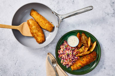 Heat a ⅓-inch layer of oil in a large, preferably nonstick, pan over medium-high heat. Once oil is hot enough that a pinch of panko mixture sizzles when added to pan, add tilapia and cook until crust is golden and fish is cooked through, 2-3 minutes per side (the smaller pieces will cook faster). (For 4 servings, fry fish in batches.)