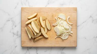 Cut potatoes into ½-inch-thick wedges. Halve, peel, and thinly slice onion.