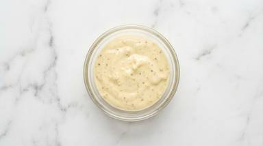 While onion cooks, in a second small bowl, combine mayonnaise, half the horseradish paste, half the mustard, and ¼ tsp sugar (all the horseradish paste, all the mustard, and ½ tsp sugar for 4 servings). (Use less horseradish paste if you’re heat-sensitive.)
