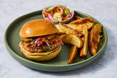 Divide burgers and potato wedges between plates. Serve with any remaining pickled veggie slaw on the side and with any remaining Szechuan mayo for dipping.