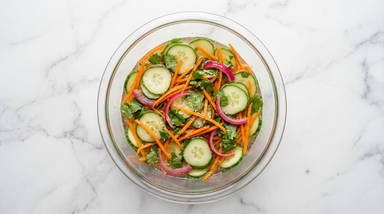 While potatoes roast, in a medium bowl, combine cucumber, carrot, vinegar, half the cilantro, 1 tsp sugar (2 tsp for 4 servings), and as much sliced onion as you like. Season with a big pinch of salt and pepper.