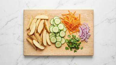 Cut potatoes into ½-inch-thick wedges. Trim and thinly slice cucumber into rounds. Trim, peel, and grate carrot on the largest holes of a box grater. Roughly chop cilantro. Halve, peel, and thinly slice half the onion (whole onion for 4 servings).